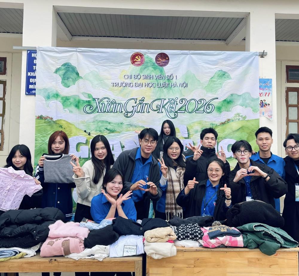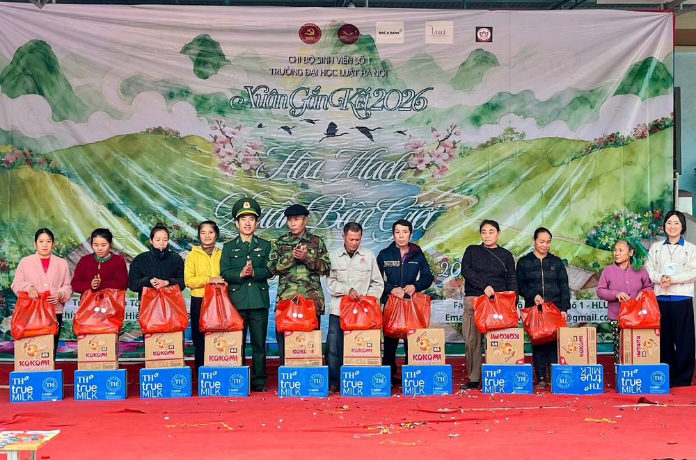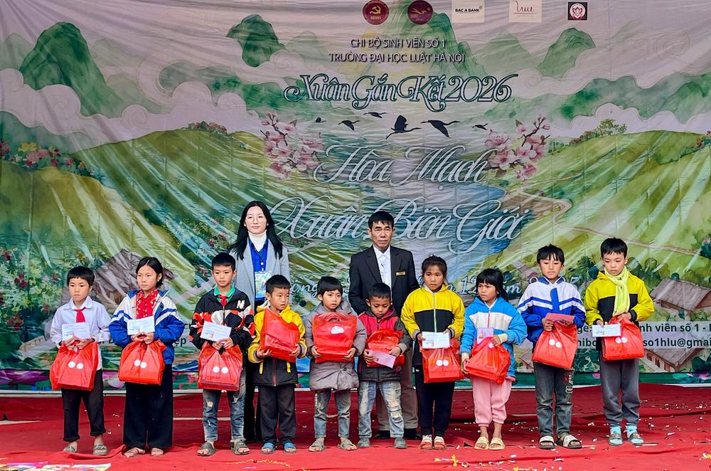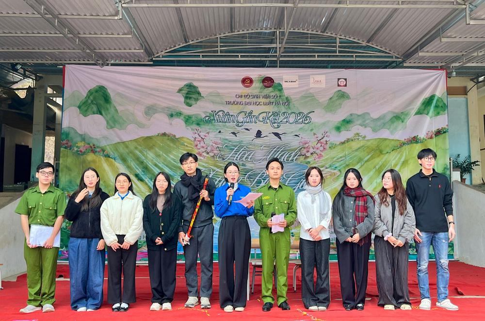 Trong hai ngày 26 – 27/12, Chi bộ Sinh viên số 1 - Trường Đại học Luật Hà Nội đã tổ chức chương trình “Xuân Gắn Kết 2026 - Hoà mạch xuân biên giới” tại Trường Phổ thông Dân tộc Bán trú Tiểu học Nhôn Mai, xã Nhôn Mai, (huyện Tương Dương cũ), tỉnh Nghệ An. Chương trình vinh dự đón tiếp sự tham dự của các đại biểu đại diện cho lãnh đạo địa phương và các đơn vị phối hợp, gồm: Đồng chí Nguyễn Văn Cường – Ủy viên Ban Chấp hành Đảng ủy, Phó Chủ tịch UBND xã Nhôn Mai; Thiếu tá Nguyễn Anh Tuấn – Đội trưởng Đội Vận động quần chúng, Đồn Biên phòng Nhôn Mai; Ông Vi Văn Hùng – Trưởng bản Tân Mai. Về phía Đoàn Thanh niên Cộng sản Hồ Chí Minh xã Nhôn Mai, có sự hiện diện của Đồng chí Lô Văn Anh – Bí thư Đoàn Thanh niên xã. Về phía Ban Giám hiệu Trường Phổ thông Dân tộc Bán trú Tiểu học Nhôn Mai, chương trình có sự tham dự của thầy Bùi Văn Hảo – Hiệu trưởng nhà trường, cùng các thầy Dương Đăng Vỹ và Trần Đức Quỳ – Phó Hiệu trưởng, và toàn thể đội ngũ thầy, cô giáo hiện đang công tác, giảng dạy tại nhà trường.